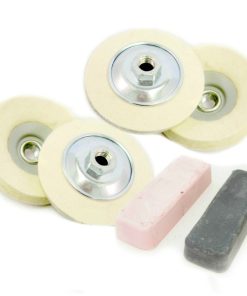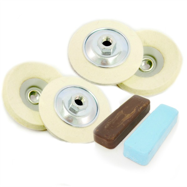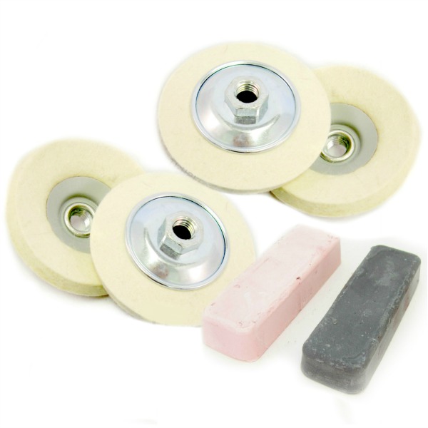 Preparing and polishing metal using an angle grinder – either stainless steel and harder metals or aluminium and softer metals. Start with the darker cutting compound first cut, then polish the metal with the lighter polishing compound. Load the felts with compound by spinning against the compound bar. Try not to overload, add more as you go. Try not to dwell in one area and keep moving over the metal. We recommend cleaning up residue and haze with Vienna Lime (not included with this kit but available).