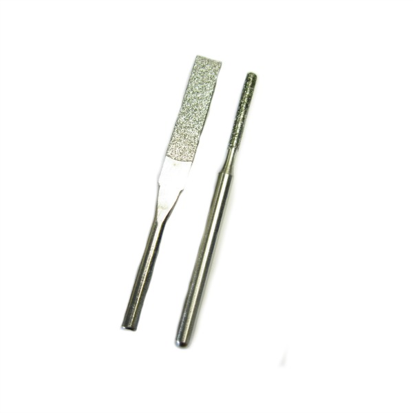 These files are 50mm overall length and are on a 3mm diameter spindle. The diamond files are available in a range of shapes and sizes.